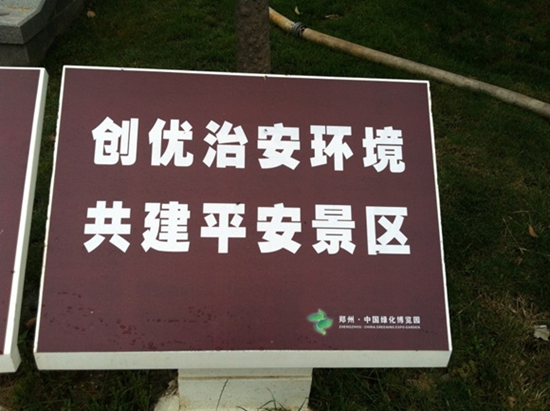 為給游客創(chuàng)建一個優(yōu)質(zhì)的平安旅游環(huán)境,鄭州綠博園在景區(qū)各處都設(shè)有景區(qū)平安建設(shè)宣傳標語、警示牌,并且在園區(qū)LED大屏上播放創(chuàng)建平安景區(qū)提示語。充分利用園區(qū)優(yōu)勢,發(fā)揮旅游活動中的知識性、教育性,做到寓教于游,努力營造“加強治安規(guī)范,創(chuàng)建平安景區(qū)”的良好氛圍,從而全面提高旅游隊伍的整體素質(zhì),提高廣大游客的平安意識。