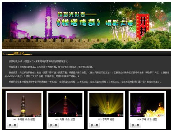 由開封宋城文化產(chǎn)業(yè)有限公司和開封網(wǎng)聯(lián)合主辦的“鐵塔光影秀—《鐵塔傳奇》攝影大賽” 投票環(huán)節(jié)已于6月24日24點圓滿結(jié)束。經(jīng)過工作人員的緊張的統(tǒng)計和專家綜合考評,網(wǎng)友褪色的膠片、開雪鐵龍的老王、黎明憑借自己高超的攝影技術(shù)摘取大賽一等獎; 網(wǎng)友金聚泰、王忠、陳力、李錚、豬八戒、barbie、小李老師、葉;、小糖蒜、夢緣今朝分別榮獲二等獎;網(wǎng)友朱炳憲、劉慧、李荷琴等50名參賽者分別獲得三等獎。(獲獎名單請查看下方附件)