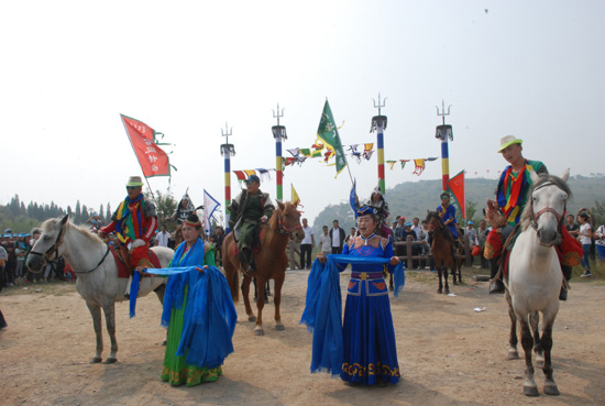 風(fēng)情節(jié)上,蒙古族專業(yè)團隊的特色歌舞表演吸引了廣大游客的眼球,聲勢浩大的馬隊迎賓,甘冽醇香的下馬酒,激動人心的馬術(shù)表演,扣人心弦的摔跤表演……使廣大游客感受到了濃郁的異域風(fēng)情,騎馬、射箭、品奶茶、祭敖包等參與項目更是倍受游客青睞。