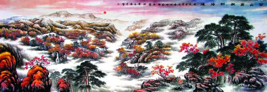 祖籍三門峽的張守堂始終熱愛家鄉(xiāng)的山山水水,家鄉(xiāng)的美景也給了他無窮的創(chuàng)作激情和靈感。為創(chuàng)作這幅國畫,他專門從北京回到家鄉(xiāng),數(shù)次登臨甘山,體會其壯麗美景,尋找最佳表現(xiàn)角度。經(jīng)過認真構(gòu)思和精心布局,張守堂夜以繼日,精雕細琢,僅用一周時間就完成了這幅作品——但見畫中紅日噴薄,云霧飄渺,峰巒疊嶂,層林盡染,瀑布飛濺,樓閣隱現(xiàn),宛若仙境。整幅作品畫中有景,景中有情,情景交融,意境深遠。