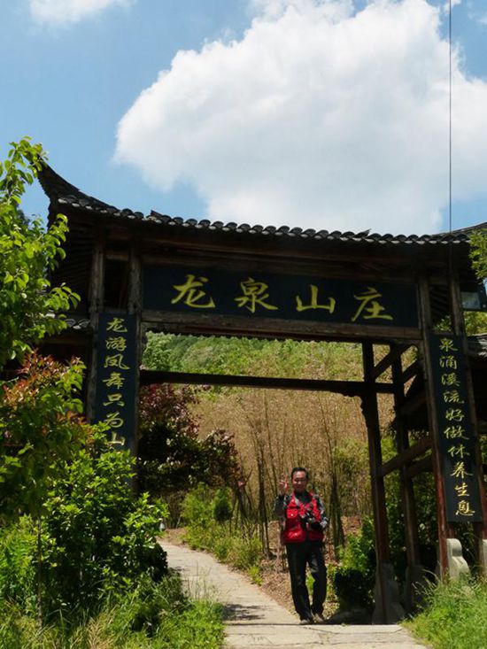 跨越九曲橋攀登臺(tái)階,北上有一高大牌坊,上書“龍泉山莊