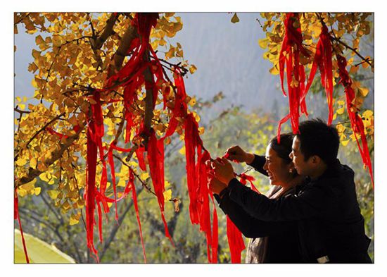 穿過(guò)牌坊即進(jìn)入結(jié)緣廣場(chǎng)。站在結(jié)緣廣場(chǎng)向北看,首先映入眼簾的是一棵千年銀杏樹,這棵千年銀杏樹很粗,粗到四個(gè)大人抱在一起才能夠勉強(qiáng)圍住,每年在這里祈福的善男信女絡(luò)繹不絕,他們只為尋得一份真摯的愛情!