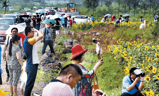 7月21日,在汝陽大虎嶺農(nóng)業(yè)公園油葵種植園,許多城里人驅(qū)車來這里觀賞油葵花海,大家還紛紛拿出相機、手機,記錄眼前的美景。這幾天從洛陽、鄭州開車來看油葵花的人真多,差不多每天都有1000多人呢!”大虎嶺農(nóng)業(yè)公園油葵種植園負責人說,看到油葵花海這么受歡迎,他們心里也很高興。