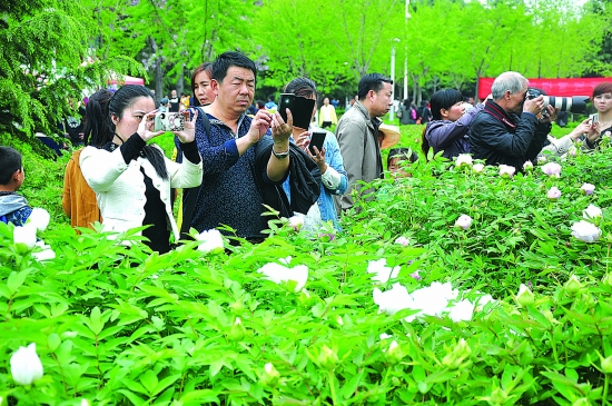 在公園門口通往牡丹苑的路上,汽車一輛接著一輛,還有不少游客選擇徒步或騎自行車前往。召公島上,雖然牡丹開得不多,但是絲毫沒有影響游客的熱情。花圃里,鳳丹牡丹和彩繪牡丹已經(jīng)綻放美麗的容顏,尤以鳳丹牡丹開得最為旺盛,大家紛紛拿出手機、相機,拍下花兒的“美貌”,牡丹苑儼然成了歡聲笑語的海洋。“咱三門峽的牡丹一點也不比洛陽的差。”市民李女士忙著拿手機拍照。她告訴記者,每年4月中旬,她都會來牡丹苑看牡丹,前幾天她還專程從靈寶把父母接來,讓父母一覽牡丹芳容。“去年來看了一次,簡直太美了,今年我?guī)е奚岬娜艘黄饋砜,我們已?jīng)拍了很多照片啦!”三門峽職業(yè)技術學院大二學生任慧開心地說。