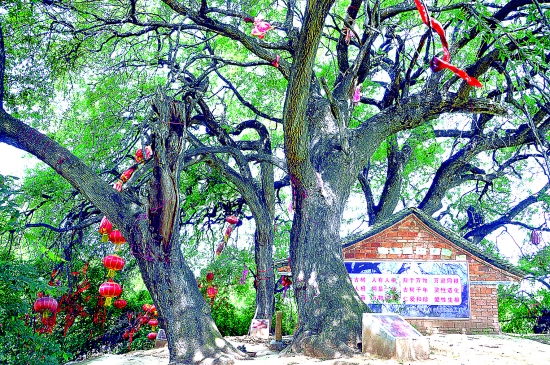橡子園位于燕子山支脈洼里、秦家河、碑基三村交界的李家原上,園內(nèi)長(zhǎng)有“九橡一”(即九棵橡樹(shù)、一棵樹(shù))10棵大樹(shù),記者看到這些古樹(shù)的主干蒼老斑駁,枝葉卻蔥蘢茂密。據(jù)介紹,園內(nèi)9棵樹(shù)的樹(shù)齡皆為1000年,1棵為200年,其中樹(shù)干最高的為15米,樹(shù)冠最大的為22米,胸圍最粗的為3.4米。樹(shù)枝上掛滿了一串串的紅燈籠,山風(fēng)徐來(lái),萬(wàn)綠叢中飛紅流彩,煞是好看。緩步于古木之間,渾身的燥熱一掃而光,頓感神清氣爽。四處打量,但見(jiàn)低處的臥枝遒勁蒼老,蜿蜒向外探出,如無(wú)數(shù)蒼龍?jiān)谒杏蝿?dòng);高處的細(xì)枝柔韌俊拔,條條向下紛披,似眾多健虬于藍(lán)天騰云探首。置身園中,仿佛已是飄飄欲仙的世外之人了。