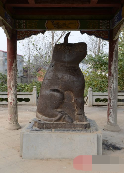 鐵牛村,拜謁鎮(zhèn)河鐵犀。鎮(zhèn)河鐵犀蹲踞在鐵牛村村北一個白墻灰瓦的院落,院落為仿古建筑。走進這個古樸的院落,穿過雜草叢生的小徑,在1982年修建的須彌座式月臺上,記者見到了通體烏黑的鎮(zhèn)河鐵犀。鐵犀安放在高約1米的青石墩上,東、北、西三面砌有蹬道,此蹬道的東西兩側(cè)立有康熙三十年(公元1691年)的石碑兩座,是當時河南巡撫閻興邦治豫期間,因3年無大水患而撰文、刻立改建的鎮(zhèn)河鐵犀廟碑和鐵犀銘碑。鐵犀坐南向北,背城面河。由翻模工藝鑄造而成,接縫明顯,造型渾厚,威武雄壯,神態(tài)逼真。它的背上有明朝河南巡撫于謙撰寫的《鎮(zhèn)河鐵犀銘》,不過字跡已經(jīng)斑駁!饵S河金石錄》中記載原文:“百煉玄金,溶為真液。變幻靈犀,雄威赫奕。填御堤防,波濤永息。安若泰山,固若磐石。水怪潛形,馮夷斂跡。城府堅完,民無墊溺。雨順風調(diào),男耕女織。四時循序,百神效職。億萬閭閻,措之衽席。惟天之俯,惟帝之力。爾亦有庸,傳之無極。”