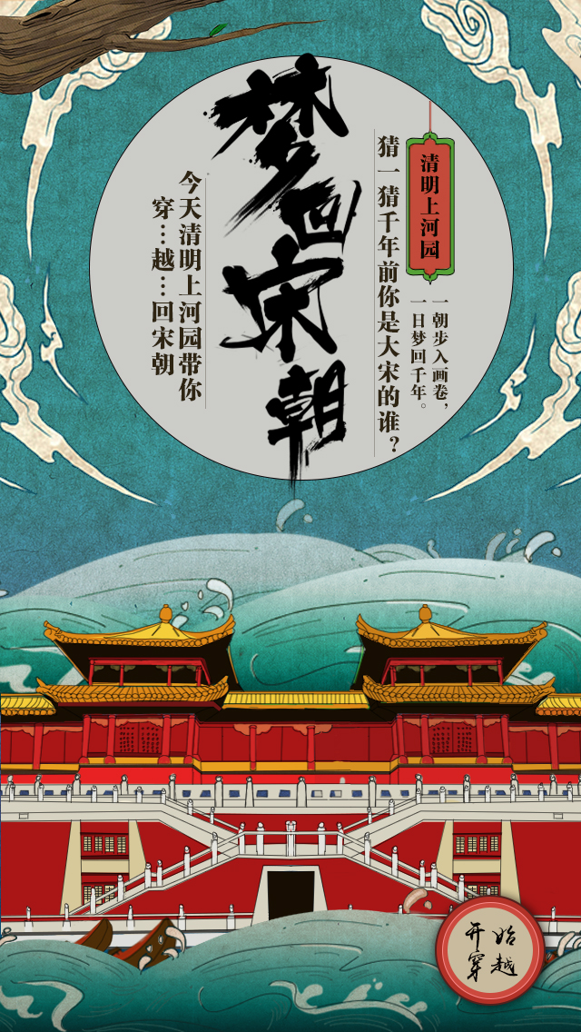 進入《夢回宋朝》H5頁面,伴隨著靜謐古典的音樂聲響起,你將進入了一個“魔性”的穿越場景,同時手機屏幕則會彈出“猜猜千年前你是大宋的誰?”、“今天清明上河園帶你穿越回宋朝”首頁字幕。