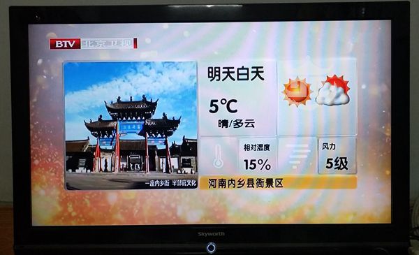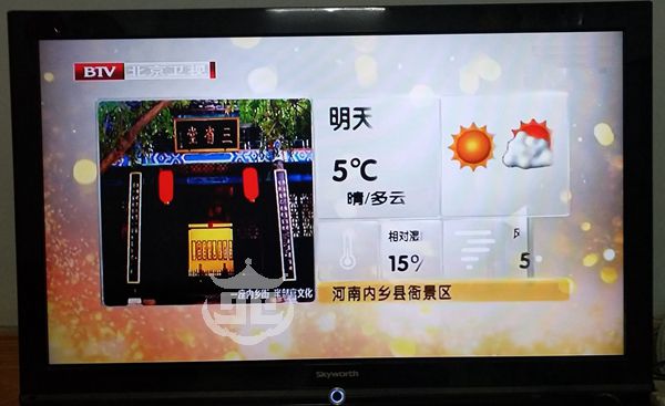 1月1日晚6點55分,北京衛(wèi)視在播報氣象信息時,選用內(nèi)鄉(xiāng)縣衙的宣化坊大門、三省堂標(biāo)志性景觀圖片作為背景。這是內(nèi)鄉(xiāng)縣2018年南水北調(diào)對口協(xié)作取得的又一碩果。北京市支援合作辦支持內(nèi)鄉(xiāng)5A級景區(qū)創(chuàng)建旅游項目資金160萬元,2018年全年在北京市電視臺《天氣預(yù)報》欄目不間斷播出寶天曼生態(tài)文化旅游區(qū)(包含內(nèi)鄉(xiāng)縣衙、內(nèi)鄉(xiāng)寶天曼和寶天曼峽谷漂流)三家景區(qū)的景觀畫面。