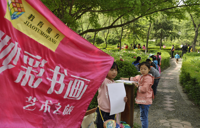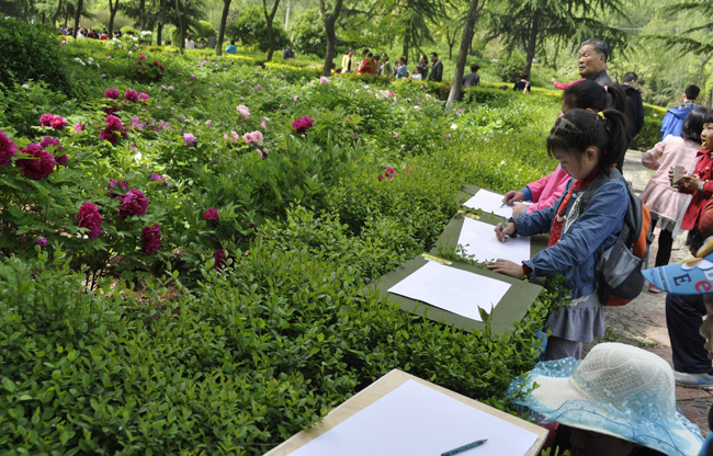 4月27日,雞冠洞春光明媚,牡丹怒放,欒川縣城“妙彩書畫”的40多位書畫小朋友在老師的帶領(lǐng)下來到雞冠洞景區(qū)寫生。