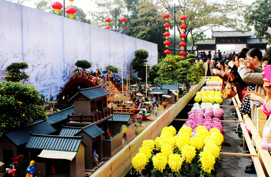 菊花版《清明上河圖》,長(zhǎng)24米,寬2.4米,依照《清明上河圖》放大制作。20余組宋代建筑模型,近800個(gè)人物分布,數(shù)十艘漕運(yùn)船只,近百匹車(chē)馬牲畜,近千株各類(lèi)菊花,數(shù)萬(wàn)枚盛開(kāi)的花朵,全新詮釋了《清明上河圖》。原畫(huà)中的樹(shù)木和植物全部用盆景菊、懸崖菊、國(guó)慶菊等菊花替代,而且布展的菊花特別選擇花期較長(zhǎng)的品種。整個(gè)布展凸顯菊花的主題,將菊花造型和古都文化相結(jié)合,將歷史搬進(jìn)現(xiàn)實(shí),將文化注入展會(huì),將盆景、雕塑、建筑、園林等多種藝術(shù)門(mén)類(lèi)與宋文化巧妙融合,通過(guò)菊花的精心布展再現(xiàn)了北宋東京的繁華,為游客提供一道美輪美奐的文化、視覺(jué)盛宴。