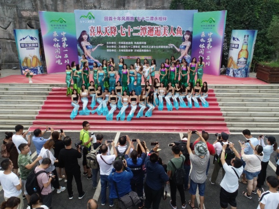 8月4日,南陽方城七十二潭風(fēng)景區(qū)十周年慶典繼開門大吉、王者歸來之后,“喜從天降”之邂逅美人魚活動開啟。 72位身著魚尾裙的美人魚,從安徒生的童話故事里走出來。在山外38℃的酷熱之下,要想安然、愜意的消酷暑,有人輕羅小扇,十里荷塘,有人一葉扁舟,醉情江河,也有人揀一處綠蔭,攬一縷清風(fēng),于詩情畫意里與清涼撞個滿懷。而72位美人魚則選擇在七十二潭風(fēng)景區(qū)里戲水游樂,享受藍(lán)天碧水,瀑布流泉。在蓮花瀑、天池、中華第一石川等景點(diǎn),美人魚流連忘返,引得游客們爭相和她們合影留念。7位美人魚登上廣裕閣和游客互動,拋繡球招龍婿,數(shù)千名游客一同見證了這一盛況。