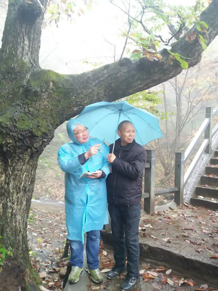 2016年10月26日,寶天曼管理局專業(yè)技術(shù)人員冒雨對寶天曼景區(qū)原始森林生態(tài)線、秋林飛瀑線、奇石險(xiǎn)峰線樹木進(jìn)行種類統(tǒng)計(jì)、細(xì)節(jié)觀察,確保制作出來的樹銘牌準(zhǔn)確無誤。