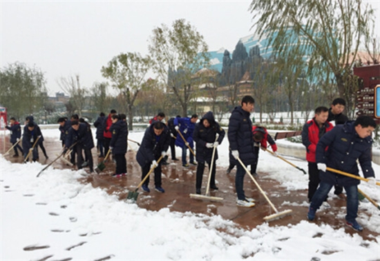 方特員工在熱火朝天的清掃主干道的積雪