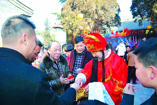 函谷關(guān)內(nèi),“財(cái)神爺”向游客送紅包,大家討到好彩頭。郭寶波 攝