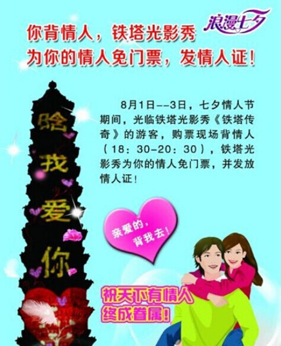鐵塔光影秀特推出了“你背情人,鐵塔光影秀為你的情人免門票,發(fā)情人證的活動。在七夕這個重要的日子里,不如跟TA去看一場難忘的鐵塔光影秀,表達你的愛意!