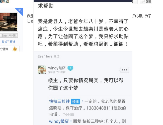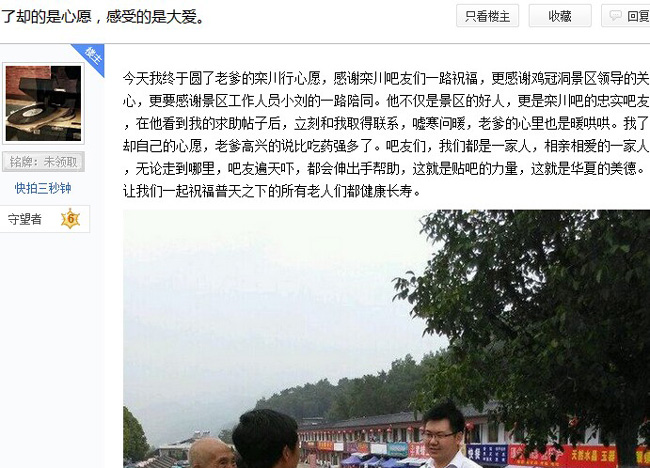 這是在幾天前,營銷部的工作人員正在發(fā)帖,突然欒川吧主一個 “@雞冠洞 --求助帖”跳了出來,工作人員根據(jù)上面提供的電話聯(lián)系到了發(fā)帖的樓主,經(jīng)過多方了解情況屬實,領導決定必須了卻老人的心愿,一定讓老人在有生之年不僅僅感受兒女的親情,家的溫暖,更要讓老人感受到社會這個大家庭對老人的關愛,于是在雞冠洞景區(qū)就上演了剛才的一幕。
