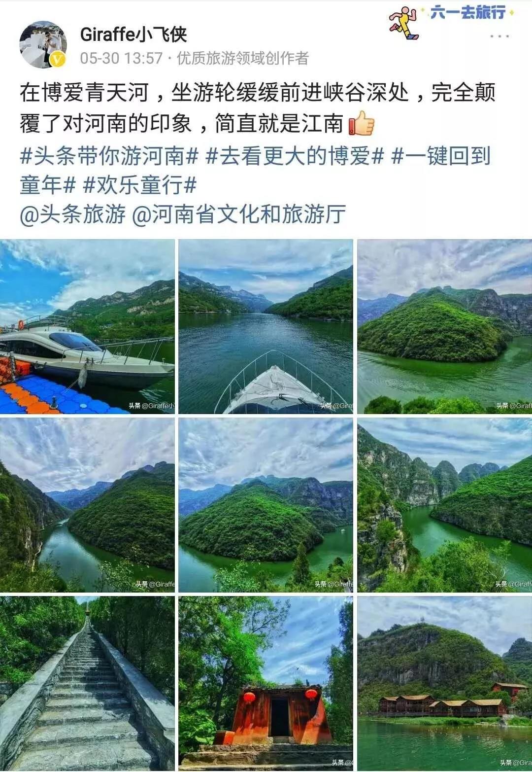 “在博愛(ài)青天河,坐游輪緩緩前進(jìn)峽谷深處,完全顛覆了對(duì)河南的印象,簡(jiǎn)直就是江南。”環(huán)球旅行探險(xiǎn)60國(guó)、擁有31萬(wàn)粉絲的文旅達(dá)人“Giraffe小飛俠”如是說(shuō)。
