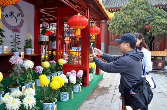 第一次來開封的丘哥被龍亭里色彩繽紛、品種各異的菊花深深吸引住了,拿起手機(jī)拍個(gè)不停。
