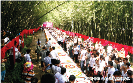 為慶祝重渡溝成立十五周年,該景區(qū)舉行了“感恩十五年,萬人生日宴”活動來吸引游客、增加特色,現(xiàn)場還制作了一個60米長的蛋糕供游客們免費品嘗。