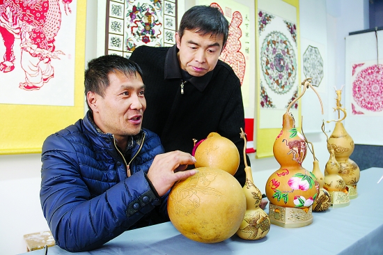 2月22日,在2016年陜州區(qū)新春文藝、民俗作品展覽會上,民俗文化藝人在展示旅游創(chuàng)意紀(jì)念品。