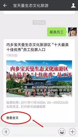 b.進(jìn)入后,回復(fù):“最美員工”或者“優(yōu)秀員工”,點(diǎn)擊‘查看全文’,進(jìn)入后即可直接投票。