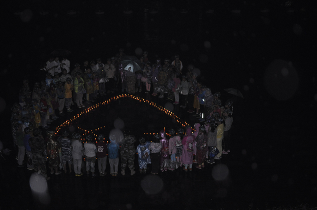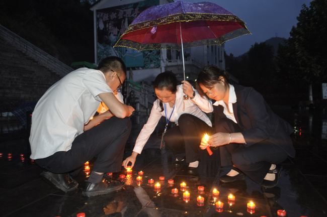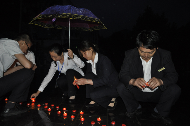 8月7日晚,天下著小雨,在雞冠洞的中心廣場上,景區(qū)員工與夏令營的小朋友一起在位魯甸祈福:魯甸加油!魯甸平安!