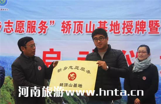 新鄉(xiāng)市文明辦副主任、新鄉(xiāng)市志愿者聯(lián)合會(huì)會(huì)長常中宜為新鄉(xiāng)志愿服務(wù)轎頂山基地授牌