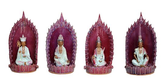 坪山鈞窯作為禹州鈞瓷代表企業(yè),一直以追尋中國(guó)文化根源,發(fā)揚(yáng)傳統(tǒng)文化精髓為理念。河南省非物質(zhì)文化遺產(chǎn)代表性傳承人、河南省陶瓷藝術(shù)大師楊廷璽在創(chuàng)作過(guò)程中,堅(jiān)持融合釋儒道各家之長(zhǎng),通過(guò)鈞瓷創(chuàng)作參悟宇宙蒼生至理,不斷推出與各種傳統(tǒng)文化相關(guān)的鈞瓷作品。鈞瓷《四大菩薩》,是根據(jù)佛教最著名的觀音、地藏、文殊、普賢四尊菩薩法像,精心設(shè)計(jì)創(chuàng)作的系列作品。四大菩薩分別象征四種理想的人格。其中文殊代表大智,普賢代表大行,觀音代表大悲,地藏代表大愿。四大菩薩居于佛座之上,神態(tài)各異,惟妙惟肖,法像莊嚴(yán)。2014年,獲得全國(guó)工藝美術(shù)大賽“百花獎(jiǎng)”金獎(jiǎng)。