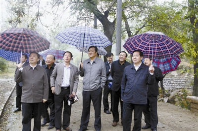 11月1日上午,副省長趙建才(右二)在信陽市委書記郭瑞民(右一)的陪同下前往平橋區(qū)郝堂村實(shí)地調(diào)研美麗鄉(xiāng)村建設(shè)中的生態(tài)環(huán)境保護(hù)工作。在認(rèn)真考察了該村的道路、綠化景觀、基礎(chǔ)設(shè)施,仔細(xì)參觀了舊居改造成的農(nóng)家樂、污水處理系統(tǒng)后,趙建才對郝堂村注重原生態(tài)建設(shè),堅(jiān)持用最自然、最環(huán)保的方式來建設(shè)美麗村莊的做法給予充分肯定。副市長張富治陪同調(diào)研。