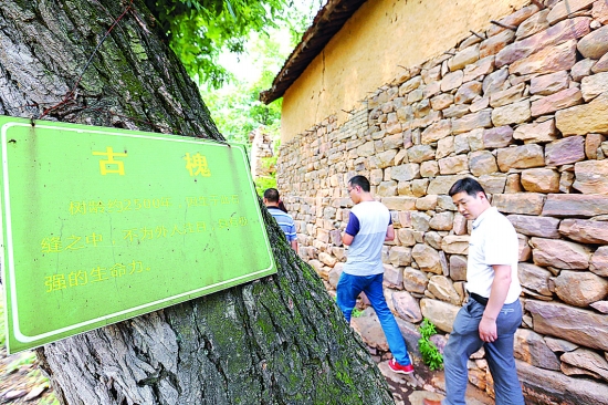 6月18日,在澠池縣段村鄉(xiāng)趙溝古村,游客從有2500年樹齡的古槐前經(jīng)過。