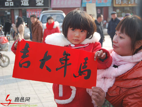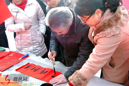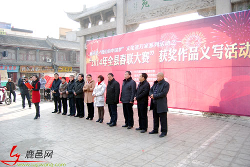 “春節(jié)前夕”,由鹿邑縣宣傳部、縣文聯(lián)、老子故里旅游景區(qū)、書協(xié)等部門組織的“我的中國夢”文化進萬家系列之一活動的2014年春聯(lián)大賽義寫活動,在鹿邑縣明道宮前弘道苑舉行,現(xiàn)場近千人參與此項活動,鹿邑縣50書法家現(xiàn)場為群眾書寫春聯(lián),由天地人筆業(yè)贊助的紅紙全部寫完,共寫三千多條春聯(lián)。