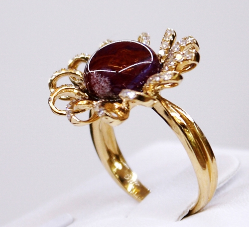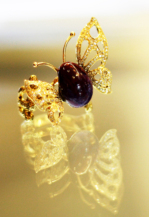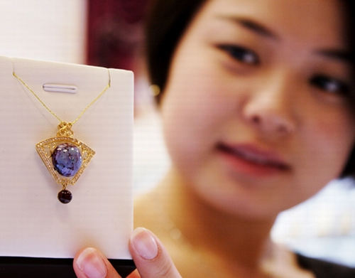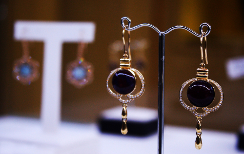 在剛剛開業(yè)的禹州坪山鈞窯展廳,傳統(tǒng)鈞瓷和鈞瓷首飾各居一個展區(qū)。與傳統(tǒng)鈞瓷展區(qū)的端莊、凝重風格不同,首飾展區(qū)從柜臺設計到燈光布置,都盡顯華麗堂皇,在明快的光色映照下,項鏈、戒指、胸針、耳墜等六大系列200余種精美首飾華麗璀璨,上面鑲嵌的紅、藍、紫、青、白各色釉珠,與金黃銀白相映生輝,精美絕倫。