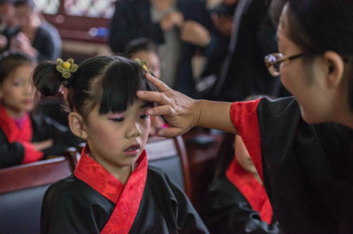 一名師長幫助學(xué)童在額頭上朱砂開智