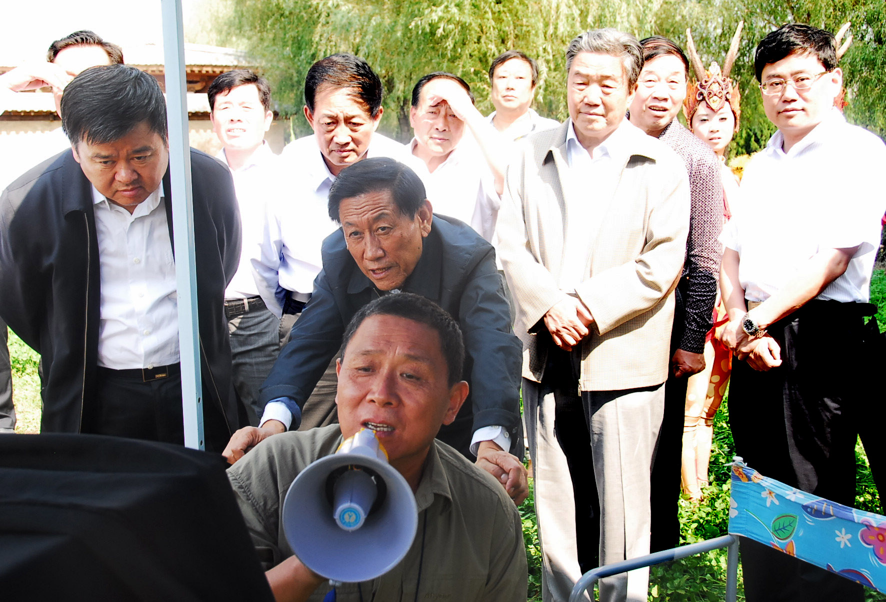 儀式結(jié)束后,到場(chǎng)嘉賓前往電影拍攝現(xiàn)場(chǎng)觀摩并看望劇組人員,王明義還慰問大青牛的飾演者劉飛和馬現(xiàn)偉,這兩位青年演員是今天最辛苦的,不但要在牛背下弓著身子,還要馱著申小梅老師一遍一遍的走,現(xiàn)場(chǎng)觀摩的嘉賓無不為之欽佩。