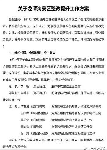 龍?zhí)稖希悍e極貫徹落實全縣A級景區(qū)整改提升工作動員會精神,組織景區(qū)全體工作人員召開專題會,安排部署整改工作,對景區(qū)進行全方位的拉網(wǎng)式排查,發(fā)現(xiàn)問題,記錄在案,采取措施,積極整改。一手抓硬件設(shè)施整改,一手抓服務(wù)意識提升,著力提升員工素養(yǎng),為游客提供家人化服務(wù),打造家庭式環(huán)境。一是成立了整改建設(shè)領(lǐng)導(dǎo)小組,保證各項工作有分工,有責(zé)任人。二是景區(qū)標(biāo)識標(biāo)牌重建的工作已經(jīng)完成設(shè)計,進入招標(biāo)階段;三是星級公廁改造在緊鑼密鼓的進行中,第一座AAA級公廁主體工程已經(jīng)完工,第二座AAA級公廁地基已經(jīng)平整好。