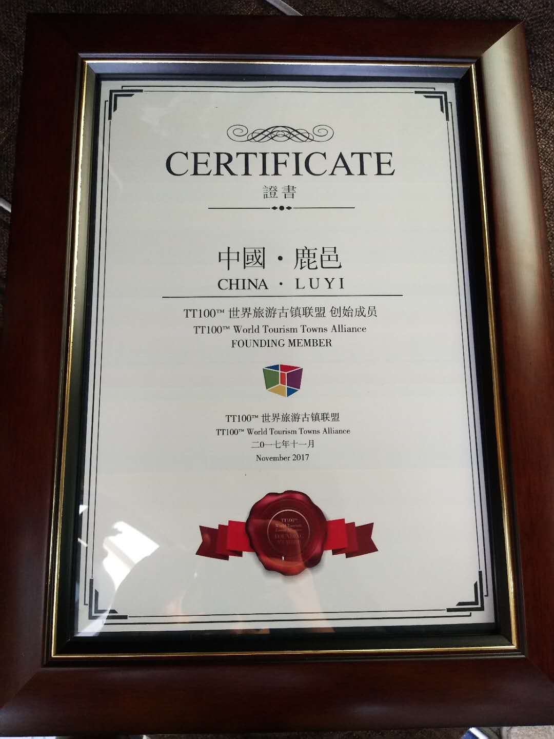 2017年11月18日,鹿邑縣旅游和民族宗教事務局代表鹿邑縣與上海朱家角、大理、平遙、武夷山等全國近30家著名古鎮(zhèn)掌門人,以及海內外文化藝術界具有全球影響力的學者、產業(yè)創(chuàng)新專家、傳媒界代 表在上海同濟大學參加了以“時光變遷、藝術創(chuàng)新、人文樂趣”為主題的TT100第二屆世界古鎮(zhèn)聯(lián)盟大會,并榮獲“世界古鎮(zhèn)旅游聯(lián)盟創(chuàng)始會員”稱號。