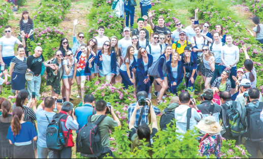 當(dāng)日上午,不少游客在當(dāng)?shù)孛倒鍒@參觀(guān)游覽。當(dāng)見(jiàn)到這些帥哥美女后,游客紛紛拿起相機(jī)或手機(jī)拍照,并主動(dòng)上前與他們合影留念。在參觀(guān)玫瑰園的同時(shí),金發(fā)碧眼的帥哥美女們列隊(duì)跳起舞來(lái)。原來(lái),他們是在為游客進(jìn)行歌舞快閃表演。
