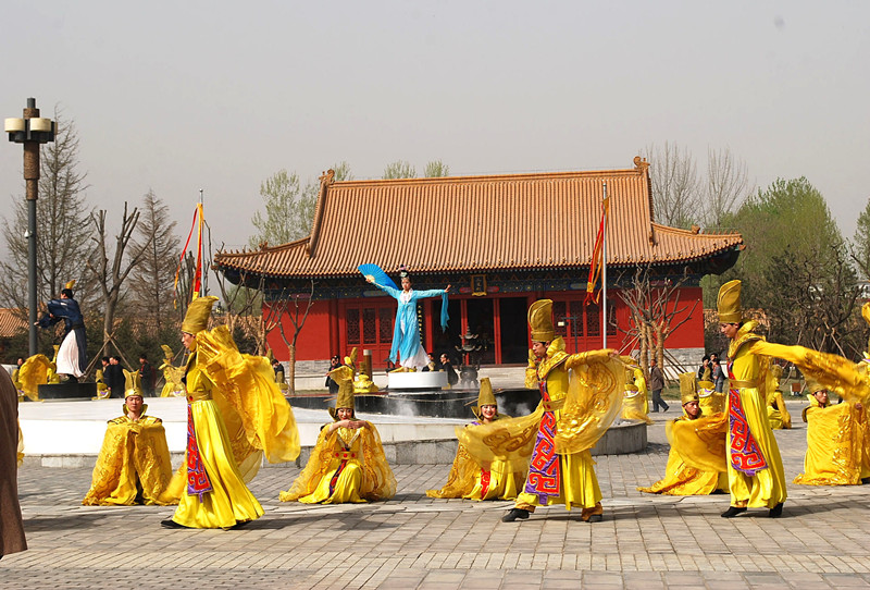 開幕式后,緊接著舉行了老子公祭典禮。整個(gè)儀式活動(dòng)共分為天禮、地儀、人樂、道和四大篇章。臺(tái)上,在曼妙的古琴聲中,身著紅黑傳統(tǒng)服飾的學(xué)生們?yōu)榇蠹疑鷦?dòng)再現(xiàn)了古人修習(xí)《道德經(jīng)》的場景......,伴隨著此場景,公祭人高聲宣讀祭文。祭文宣讀結(jié)束后,鹿邑縣副縣長李幫儒與嘉賓一起向老子像獻(xiàn)花,表達(dá)對“人文共祖”的崇敬情懷,并與陜西作協(xié)主席、、當(dāng)代著名作家賈平凹等合影留念。同時(shí),在太清殿廣場、玉皇殿四象廣場、上清門廣場還進(jìn)行了古裝禮樂、太極拳等大型演出。