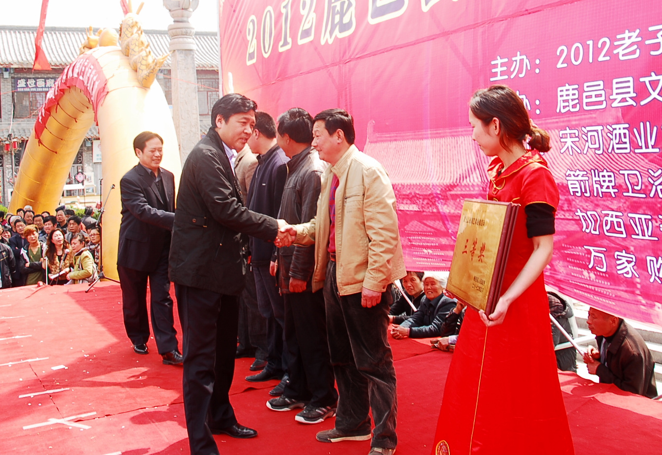 4月5日,由鹿邑縣文化局組織,鹿邑縣文化館、演出管理站承辦,啟亮文化藝術(shù)中心、宋河酒業(yè)鹿邑直銷處、名牌商家聯(lián)盟等商家協(xié)辦的鹿邑縣“名牌商會聯(lián)盟杯”民間文藝展演在鹿邑縣明道宮景區(qū)弘道苑廣場隆重舉行。鹿邑縣“名牌商會聯(lián)盟杯”民間文藝展演由各鄉(xiāng)鎮(zhèn)選送的墜子、大鼓書、曲劇、小品、盤鼓、舞龍等20多個精彩節(jié)目組成,為廣大游客奉上了一份豐盛的文化大餐。該文藝展演既是老子生日廟會的又一大亮點,也是為期一個月的2012年老子廟會收官之作,獲得了圓滿的成功。 鹿邑縣縣委常委宣傳部長王怡、縣政協(xié)副主席鮑遠光、縣人大副主任高林、縣政府副縣長宋濤、縣文化局局長張險峰、縣旅游局副局長(太清宮景區(qū)管理委員會主任)于欽友、縣旅游局副局長(老子故里旅游景區(qū)管理處主任)張偉、縣城管局局長康子印等單位領(lǐng)導以及宋河酒業(yè)鹿邑直銷經(jīng)理呂合法、名牌商家聯(lián)盟會長周從軍等工商界代表出席觀看了演出,并為獲獎單位頒發(fā)了獎牌和獎金,共計發(fā)放獎金5.5萬元。( 王廣鋒 蔣保慶 攝)
