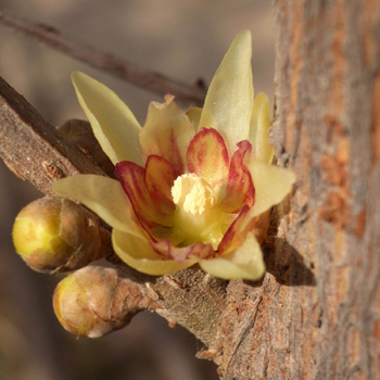 蠟梅并非梅類,兩者親緣甚遠(yuǎn)。在植物分類學(xué)上,蠟梅屬蠟梅科落葉灌木,梅則是薔薇科植物。由于它們相繼在寒冬臘月或早春時節(jié)開花,而且花形、花香相近,所以常被人們誤認(rèn)為是同種。蠟梅的花單生于枝條兩側(cè),花被多數(shù),內(nèi)層較小,色紫紅;中層較大,色黃,略有光澤,似蠟質(zhì);最外層由細(xì)小的鱗片組成,萼片與花瓣相似。