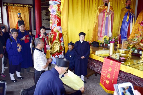 臺灣“我愛中華”文化參訪團在太清宮太極殿集體祭拜了道祖老子,又先后參觀了老子誕生處太清宮、老子講學處明道宮、老子文化廣場等景區(qū)景點,太清宮石永田、魏圓喜、趙圓霞、楊圓杰等道長為楊辰威、沈鴻良、蔡瑛瑛舉行了拜師祭祖儀式,周口雕塑大師張城鎮(zhèn)帶來的王靈官和關圣帝君泥塑神像博得了大家嘖嘖稱贊(其中的王靈官神像被臺灣臺中市玄元宮宮主盧圓喜確認恭請)。在由太清宮道觀承辦的交流座談會上,臺辦王鹿山主任首先熱烈歡迎臺灣嘉賓的到來,宣布了鹿邑老子故里旅游區(qū)被命名為“河南省對臺交流基地”的喜訊,介紹了對臺交流政策和支持措施,肯定了太清宮、臺灣太清蓬萊龍門傳道宗及林圓安道長等團體和個人為豫臺、鹿臺交流做出的努力和取得的成果,并表示今后將繼續(xù)大力支持更多的各界之士積極投身兩岸交流促進活動,為推動兩岸文化、經(jīng)濟發(fā)展做出更大努力;董延喜在發(fā)言中稱贊了鹿邑近年來弘揚老子文化、道家文化取得的優(yōu)異成果,今后將積極聯(lián)合兩岸建立全新的交流機制,進一步提升交流效果;臺灣楊辰威道長在答謝致辭中表示感謝鹿邑領導、部門和太清宮的熱情接待,回“家”的感覺真好,以后要組織更多的人;“家”看看,出力獻策建設鹿邑祖庭。