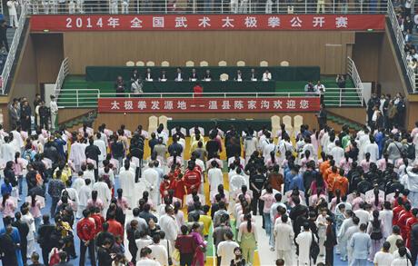 在國家體育總局武術(shù)運管中心副主任陳國榮的宣布之下,昨天上午8點30分,2014年全國武術(shù)太極拳公開賽在太極拳發(fā)源地河南溫縣陳家溝拉開帷幕,來自全國18省市的118支代表隊齊聚溫縣陳家溝國際太極拳文化交流中心,據(jù)了解,本次共有1500多名太極高手參加比賽,未來三天即將在陳家溝武場上一決高下。