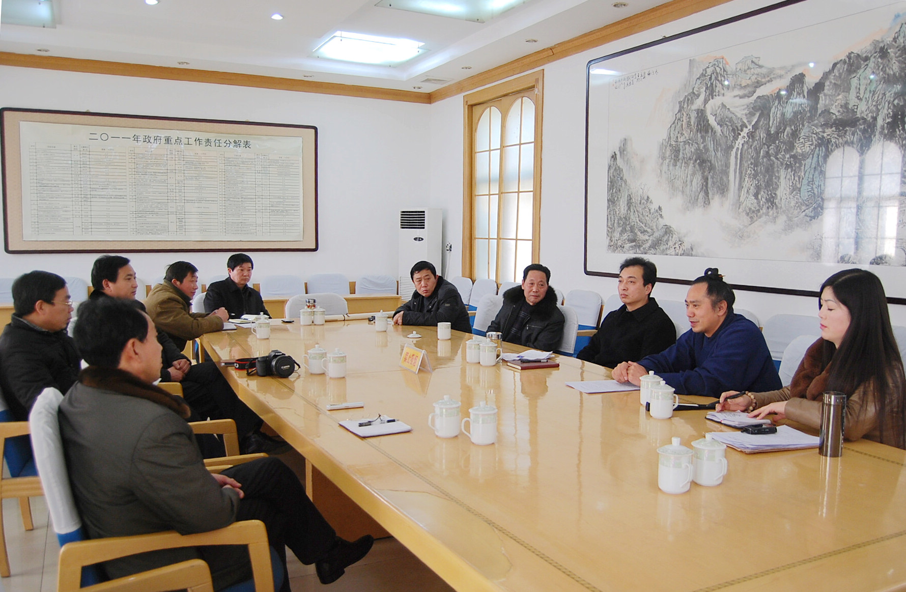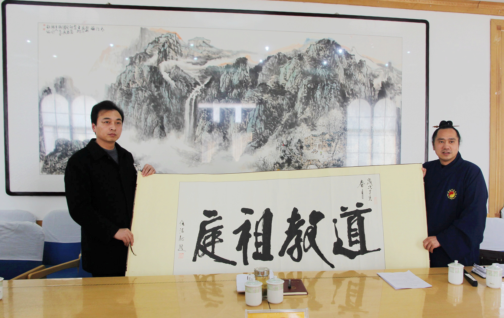 近日,在鹿邑縣政府會(huì)議室,國(guó)際道教協(xié)會(huì)會(huì)長(zhǎng)、鹿邑縣政協(xié)委員、鹿邑縣道教協(xié)會(huì)會(huì)長(zhǎng)、太清宮住持黃世真受全國(guó)政協(xié)常委、中國(guó)道教協(xié)會(huì)會(huì)長(zhǎng)任法融的委托,手捧裝裱一新的任法融道長(zhǎng)于2007年為鹿邑縣題寫“道教祖庭”原稿交送到鹿邑縣縣長(zhǎng)朱良才的手中?h人大副主任張光興、旅游局長(zhǎng)丁震、政府辦主任肖西國(guó)、民宗局局長(zhǎng)吳之彬、太清宮景區(qū)管委會(huì)主任于欽友、明道宮管委會(huì)主任張偉等部門負(fù)責(zé)人參加了交接儀式。