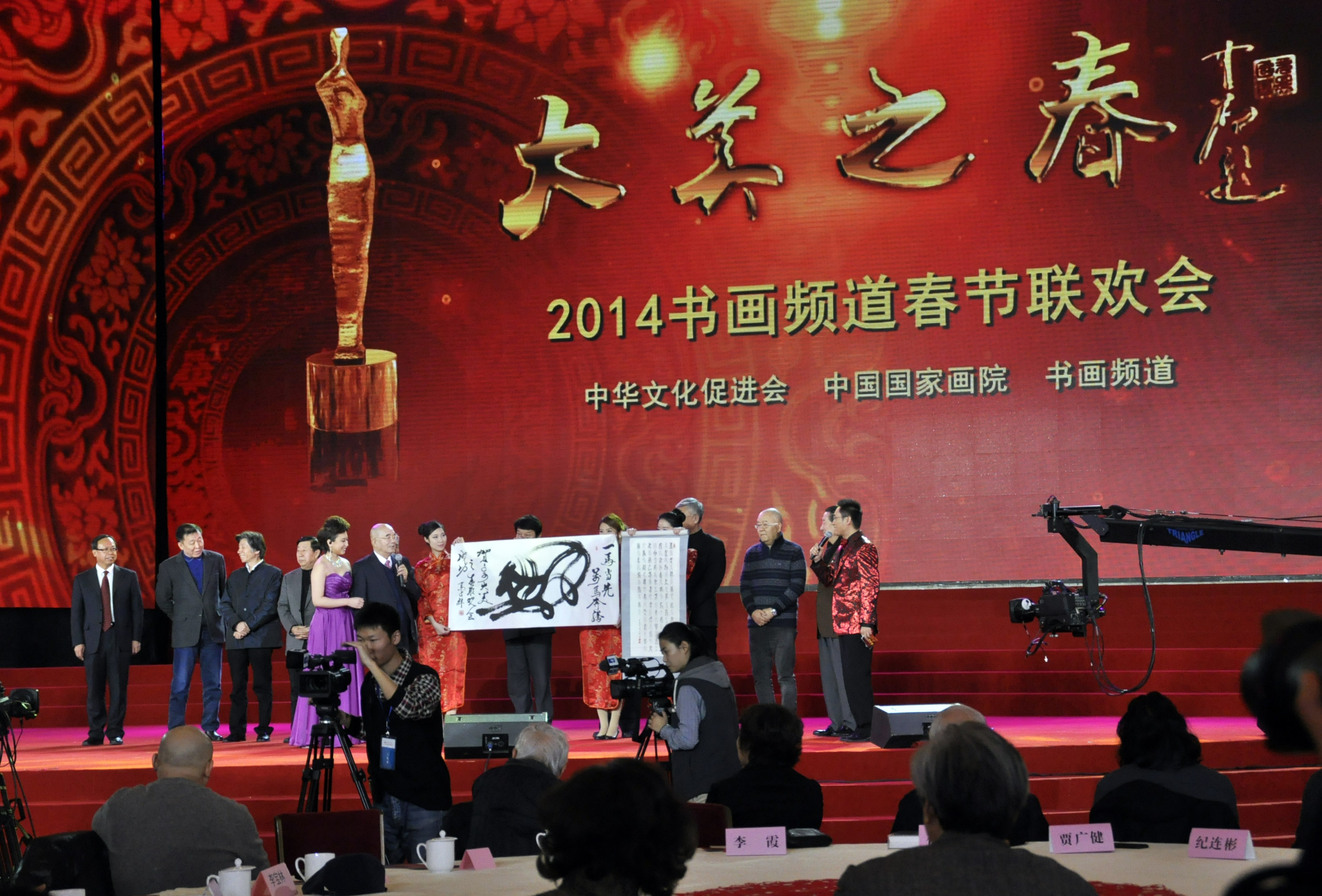 近日,“2014大美之春”春節(jié)聯(lián)歡晚會(huì)在北京人民大會(huì)堂二層宴會(huì)廳舉行。晚會(huì)由中華文化促進(jìn)會(huì)、中國國家畫院、中央數(shù)字電視書畫頻道聯(lián)合主辦,著名主持人朱軍、經(jīng)緯與書畫頻道主持人蔣熹多和薛夏共同主持。中國文聯(lián)榮譽(yù)委員高占祥,中國文聯(lián)副主席覃志剛、馮遠(yuǎn),中國文聯(lián)副主席、中國美協(xié)主席劉大為以及知名藝術(shù)家、媒體記者、企業(yè)負(fù)責(zé)人1000余人出席,可謂是名院、名家、名企共聚一堂,河南省鹿邑縣天地人筆業(yè)公司也應(yīng)邀參加了這次盛會(huì)。