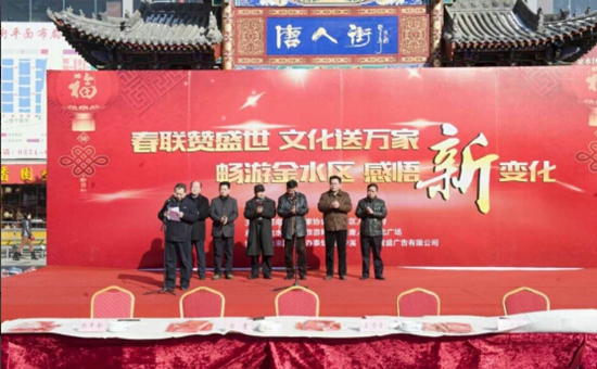 春聯(lián)贊盛世,文化送萬(wàn)家,暢游金水區(qū),感悟新變化。2016年1月23日上午,由鄭州市金水區(qū)人民政府、金水區(qū)文化旅游局、河南省書(shū)法家協(xié)會(huì)、鄭州唐人街文化廣場(chǎng)聯(lián)合舉辦的“2016年金水區(qū)迎新春、送文化、送溫暖、游金水公益活動(dòng)”在唐人街文化廣場(chǎng)熱熱鬧鬧地舉行。