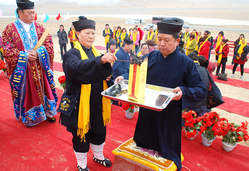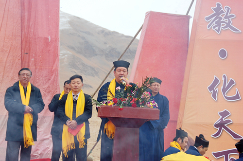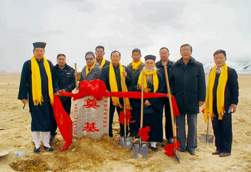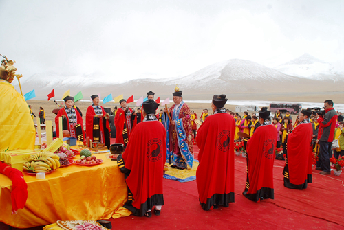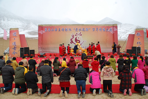 參訪團在青海省格爾木市,參加了昆侖山西王母瑤池“老水還潮”萬年祈福大典,格爾木市電視臺、日報社等多家媒體記者進行了現(xiàn)場采訪。4月21日是農(nóng)歷三月三,是西王母舉行蟠桃盛會的日子。當(dāng)日舉辦的祈福大典現(xiàn)場,瑞雪天降,祥鳥翻飛,“道•通古今;教•化天下”、“八方朝拜道法純正自然•通天道場普渡眾生增福”的金色字幅在昆侖林立奇峰、皚皚白雪的映襯下更顯得莊嚴肅穆。來自青海本地和河南省、安徽省、陜西省等各地的道長、弟子、信士及各界人士百余人身披黃佩巾、靜默肅立,依次向王母娘娘金像敬獻祭品、花籃,上香、升表,敬拜祈福。隨著鏗鏘激昂的鼓樂,河南省開封市無梁廟劉明明道長和老子故里鹿邑縣太清宮趙圓霞道長率眾高工舉行了隆重的祈福道場。河南省鹿邑縣旅游工作者蔣保慶主持祈福大典,格爾木市旅游局局長劉宗旭、臺灣長老邱圓山、安徽綠源醫(yī)藥有限公司董事長張健、祈福道場發(fā)起人河南鄭州劉明軍先后致辭講話,追思中華母親王母娘娘的無量功德,弘揚道教文化,增強中華民族的認同感與民族向心力、凝聚力,共同祝愿中華兒女平安幸福,實現(xiàn)民族偉大復(fù)興,早日實現(xiàn)中國夢的美好愿景。同時大家也表示了要集聚海峽兩岸和內(nèi)地各地力量進一步挖掘昆侖文化資源,提升格爾木作為昆侖神話的發(fā)源地、道教文化的發(fā)祥地和昆侖文化誕生地的影響力,積極推動文化與旅游融合發(fā)展,構(gòu)建以昆侖文化為主體的多元文化新格局。隨后眾嘉賓又在大典現(xiàn)場的昆侖山南坡舉行了昆侖道祖萬圣閣奠基儀式,驅(qū)車西上在西王母瑤池湖南畔舉行了瑤池宮奠基儀式,并在奠基碑前合影紀念。在瑤池潔白雪景前,綿綿昆侖,祥云團團,人人心潮澎湃、遐想連篇。在格爾木市旅游局安排下,參訪團還先后參觀了察爾汗鹽湖、胡楊林等景區(qū)景點。