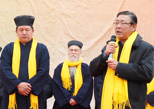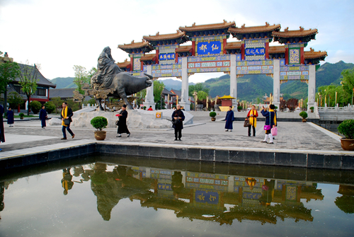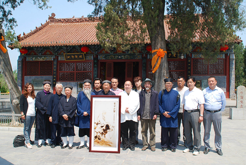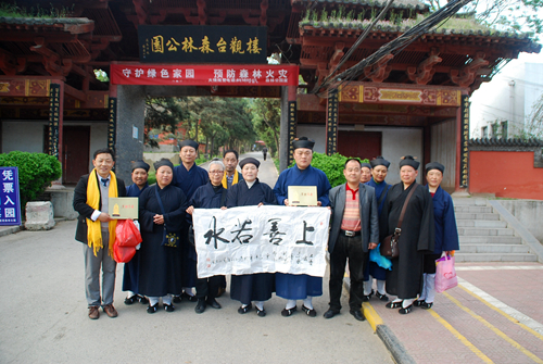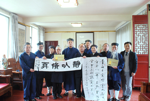 在蘭州市白云觀,蘭州市道教協(xié)會常務(wù)理事、副會長彭理福道長等在辦公室為參訪團道長們讓座沏茶,大家親切交談,并向每位參訪團成員贈送了《道教常識》、《道教早晚課》等書籍。白云觀又名呂祖廟,始建于清道光十七年(公元1837年),觀內(nèi)供奉有呂洞賓的塑像,大門前的緬甸花梨木天然形成的“老子問天”根雕圣像高3米。“老子”張開雙臂,向上托起,衣袖垂地;從它的天然衣袖中展現(xiàn)出“肚中乾坤大,袖中日月長”的文化思想,體現(xiàn)了老子的“守,忘,思,動靜合一”的人文情態(tài),詮釋了道法自然、天人合一,人類和平,世界大同;引得大家紛紛駐足拍照留影。陜西省周至縣樓觀臺,傳說老子在此講授過道德五千言。參訪團成員在說經(jīng)臺榮幸與中國道教協(xié)會會長任法融道長交談,贈送了李富春書寫的《道行天下》字幅,任會長欣然與大家合影。在樓觀臺仙都和森林公園管委會領(lǐng)導(dǎo)的安排下,參訪團人員參觀愉快,流連忘返。河南省三門峽市靈寶市函谷關(guān)始建于西周,是我國歷史上建置最早的雄關(guān)要塞,建關(guān)3000年間曾經(jīng)發(fā)生過大小戰(zhàn)役200多次;春秋末期,道家鼻祖老子在此著寫了洋洋五千言的《道德經(jīng)》,開創(chuàng)了我國獨有并影響世界的道家文化,奠定了道教文化的發(fā)展基礎(chǔ)。參訪團來到函谷關(guān)時,函谷關(guān)歷史文化旅游區(qū)管理處常務(wù)副主任焦新成親自全程陪同講解交流,并安排了講解員和觀光車,延長工作時間方便大家參觀,參訪團成員紛紛稱贊。