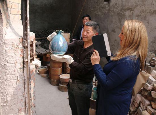 5月8日,希臘亞洲藝術(shù)博物館館長贊尼奧蒂一行又來到禹州神垕古鎮(zhèn)進行參觀考察。他們先后來到大師工作室,觀看傳統(tǒng)的拉坯技藝,見證開窯的神奇瞬間,并走入古鎮(zhèn)老街感受千年古鎮(zhèn)的獨特魅力。參觀完成后,贊尼奧蒂表示,整個過程非常精彩,自己終于親眼看到曾在倫敦大學(xué)書本上學(xué)到知識,感覺鈞瓷不管是造型、顏色都美麗獨特,很期待以后有機會可以與鈞瓷大師共同創(chuàng)作。