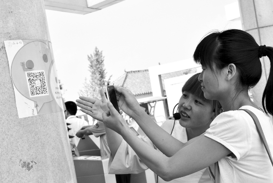 6月5日,游客正在靈寶市函谷關(guān)歷史文化風(fēng)景區(qū)導(dǎo)游的指導(dǎo)下掃描微信。今年是靈寶市旅游“開發(fā)建設(shè)年”,該市通過開通旅游微信平臺(tái)、開設(shè)報(bào)紙旅游專版等方式,從產(chǎn)業(yè)發(fā)展、文化底蘊(yùn)、歷史傳說、名人典故等對(duì)旅游產(chǎn)業(yè)進(jìn)行全方位宣傳推介。