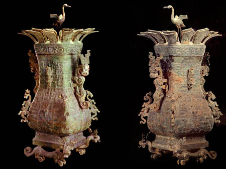青銅蓮鶴方壺為春秋早期鄭國(guó)國(guó)君鄭子?jì)胨涠Y器,是國(guó)君地位與權(quán)利的象征,僅兩只,其中一只藏于河南博物院,是河南博物院13多萬(wàn)件文物中最具觀賞價(jià)值的收藏品,被公認(rèn)為這個(gè)國(guó)家級(jí)博物院的鎮(zhèn)院之寶。它亦是有“地下文物全國(guó)第一”之譽(yù)的河南在出土文物方面的杰出代表。